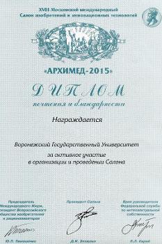 From 2nd to 5th April, a delegation from Voronezh State University took part in the Moscow International Inventions and Innovative Technology Salon "ARCHIMEDES–2015" held at Convention and Exhibition Centre "Sokolniki". Among the co-organisers and partners of the Salon are the World Intellectual Property Organization, the Administration of the President of the Russian Federation, and the Government of the city of Moscow. Salon was attended by over 500 representatives of 42 regions of the Russian Federation as well as inventors from 16 countries: Great Britain, Taiwan, Germany, Malaysia, Korea, Venezuela, Serbia, Croatia, Romania, Qatar, Bahrain, Kazakhstan, Poland, Ukraine, Moldova and Belarus. About 1000 projects in various spheres of science and technology were presented.
