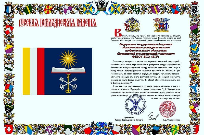 Voronezh State University got its new heraldry officially registered by the Voronezh regional heraldry society, and the new coat of arms and flag of the University were matriculated by the Russian national heraldry society. The Rector's standard was handed to the VSU Rector Dmitry Endovitsky. The certificates received by the University mean that the VSU heraldry is officially registered and recognised.