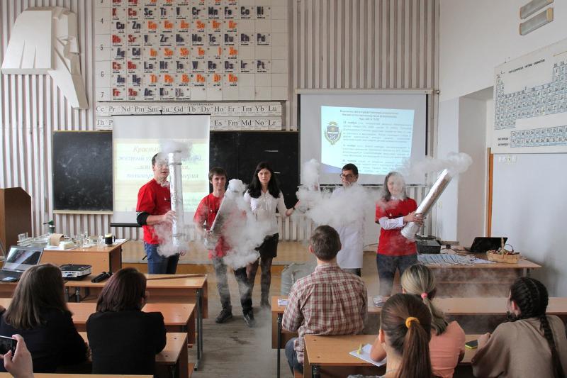 He also demonstrated experiments by which red phosphorus turns white and which show some reactions of solid white phosphorus and solutions. Moreover, the schoolchildren could learn how to get ozone as a result of chemical reaction and allotropic transformations in overheated sulphur vapour under temperature variations.