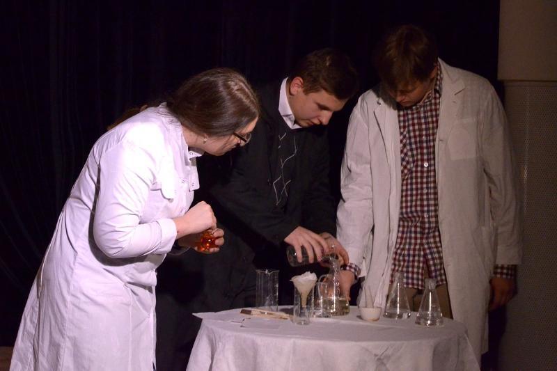 On 30 October, the first performance within the scientific and educational project "Science Theatre" was held in the main hall of the Petrovskiy book club. The idea of such a theatre was suggested by Anna Kokhanovskaya, a student of the Faculty of Physics. It was first highly praised at one of VSU’s innovation projects competitions, and later became a laureate of “Project Conveyor” within the framework of the National Educational Forum “Territory of the Meaning” on the Klyazma River. All the actors are students. The first play tells the story of invention of the Zelinskiy gas mask, a device that has saved thousands of lives.