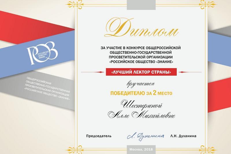This year, lecturers from 55 Russian regions participated in the competition. Alla Shesterina took second place, and her lectures were praised by the jury as being up-to-date, modern, socially and practically important. They also praised the rhetorical skills of the lecturer.
