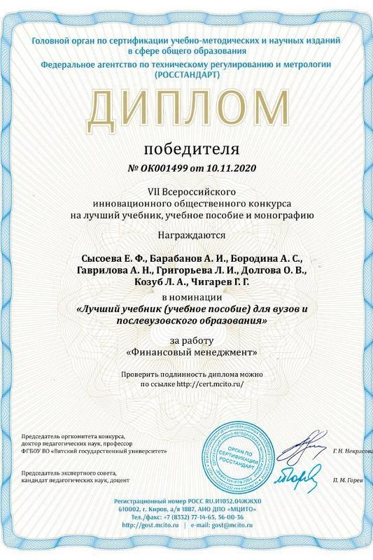 The results of the 7th National Innovation Public Contest for the best text book, study guide, and monograph were concluded. The study guide “Financial Management” prepared by the Department of Finances and Credit at the Faculty of Economics of Voronezh State University was granted the winner's certificate in the nomination “Best text book (study guide) for universities and further education institutions”.