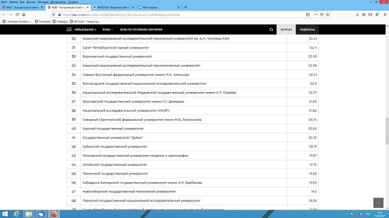 On 15 April, the RAEX ranking agency published the rankings of best Russian universities in the fields of mathematical and natural sciences and engineering. VSU took 32nd place in mathematical and natural sciences and 48th in engineering.