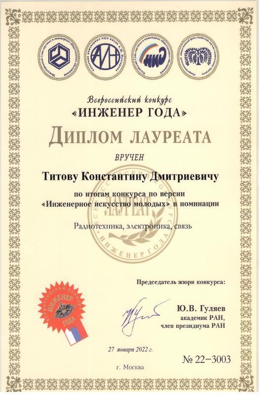 Konstantin Titov, Associate Professor at the Department of Radiophysics of the Faculty of Physics at VSU, won the annual national contest “Engineer of the Year” in the category “Young Engineers” (“Radio Engineering, Electronics, and Communication”). The contest evaluates the performance of engineers employed in companies, organisations, and institutions. It reveals the best engineers in the country, promotes engineering, highlights the achievements and experience of Russian engineers, and draws attention to the problems of engineering in Russia.