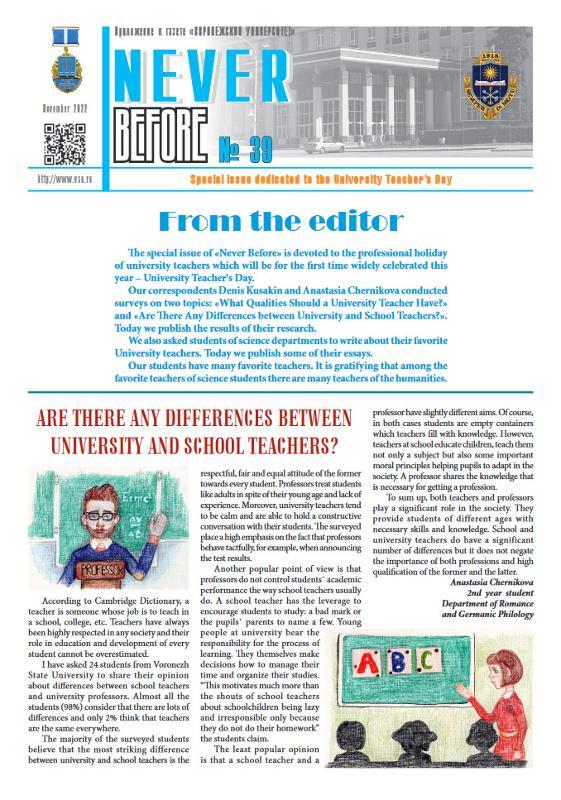 A new issue of Never Before, a supplement to the “Voronezh University” newspaper, is now available online. The issue is dedicated to the upcoming celebration of the Day of the Higher Education Teacher.