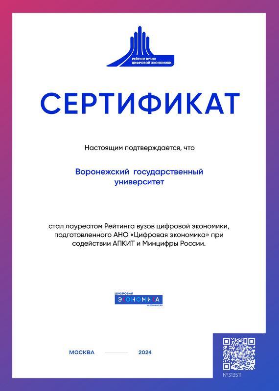 Voronezh State University took tenth place in the final regional ranking of universities of the digital economy presented by Non-Profit Autonomous Organisation “Digital Economy” with the support of the Ministry of Digital Development and the Association of Computer and Information Technology Enterprises.