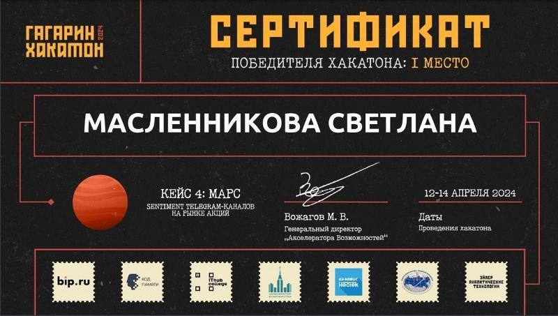 Svetlana won the fourth case: Sentiment of Telegram channels on the stock market. Maslennikova had to solve the issue of text processing in two stages: recognition of named entities and analysis of the text sentiment related to each entity. Among the conditions were time limit for working on the solution and no use of the GPU (graphics processing unit). In total, hackathon participants were given five tasks from partner companies: BIP.RU, Kod Pamyati, IT HUB, Euler Analytical Technologies, and Elvis-NeoTech. The expert jury of the hackathon consisted of representatives of partner companies.