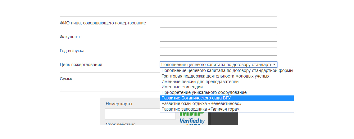 - Через форму сайта, пройдя по гиперссылке и выбрав Цель пожертвования «На развитие Ботанического сада ВГУ»: