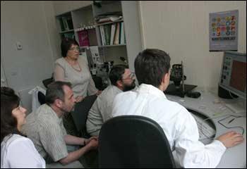 Зав. лаб. "Наноскопии и нанотехнологий" Битюцкая Л.А. знакомит с новыми возможностями лаборатории гостей и сотрудников ВГУ проф., зав.отд. ИОНХ им. Курнакова РАН Маренкина С.Ф., ст.н.с. хим.ф-та Логачеву В.А., проф. ВГПУ Афонина Н.Н.