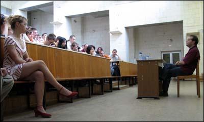 На встрече присутствовали около ста преподавателей, аспирантов и студентов различных факультетов университета. Темами полуторачасовой беседы стали: современная политическая обстановка в России, состояние телевидения и средств массовой информации в целом, перспектива проведения в России честных и демократических выборов, личные творческие планы журналиста.