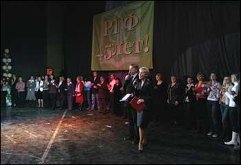 В течение всего вечера не смолкали поздравления в адрес факультета, прозвучала масса приятных пожеланий. Праздничный концерт, прошедший под общей тематикой "танцы со звездами", был насыщенным и разнообразным. Преподаватели и выпускники факультета демонстрировали свои танцевальные таланты под бурные аплодисменты. Восторг зрительного зала вызвали танго "Ночь в Испании", "Баварский танец", "Украинский танец", французский танец "Мужчина и женщина", а также хор преподавателей, шуточные миниатюры, танцы студентов, миниатюра студии "Виражи" в составе выпускников РГФ, которая приносила призовые места факультету в "Веснах" в 70-80 гг.