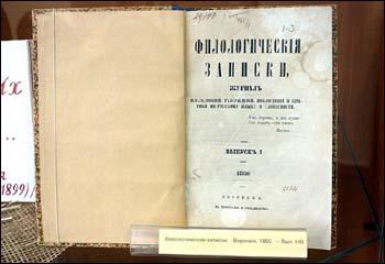 На выставке представлен первый номер журнала «Филологические записки» за 1860 год, а также номера, в которых опубликованы материалы о самом журнале и о его первом издателе.