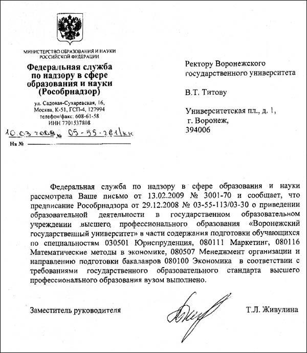 Получено письмо Рособрнадзора о выполнении ВГУ предписания от 29.12.2008: