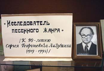 На выставке представлены монографии и учебные пособия С.Г. Лазутина «Русская частушка» (Воронеж, 1960), «Русские народные песни» (М., 1965) и др. Здесь можно увидеть книги с дарственными надписями и автографами из владельческой библиотеки учёного.