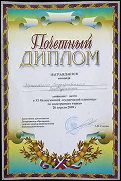 Кроме того, студенты ВГУ показали очень хорошие результаты и в личном первенстве. Так, Сергей Зиновьев стал победителем олимпиады по английскому языку, Елена Чеботарева - по французскому. Второе место по немецкому языку завоевала Маргарита Воронина, а третье место по французскому языку досталось Алевтине Кондратенко. Остальные наши участники тоже не остались без дипломов - Виктор Диденко стал победителем в номинации "Монологическое высказывание", а Марина Гребенщикова получила диплом второй степени в конкурсе среди студентов естественных факультетов.