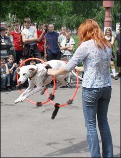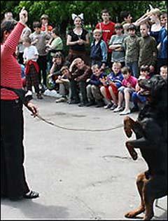 Завершающим аккордом визита стало выступление двух ученых собак, ротвейлера Армана (дрессировщица Юля Прядкина) и далматина Бесси (дрессировщица Лена Харахурсах), которые приехали вместе со студентами-физиками порадовать детишек из интерната.