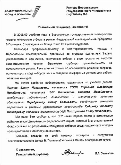 На имя ректора ВГУ Владимира Титова пришло благодарственное письмо из Благотворительного фонда В. Потанина.