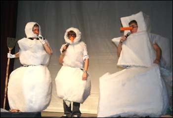 Далее на сцене появилась веселая троица снеговиков. Публика в восторге: абсолютно разные, яркие персонажи – один из них в итоге оказался ненастоящим снеговиком, что очень разочаровало «снежную бабу», другой – квадратным, как кубик. А Деды Морозы, которые между выступлениями по сценарию обирали соседние дома, очутились уже у кого-то в гостях и устроили там кавардак… Танцы и песни - всё смешалось!