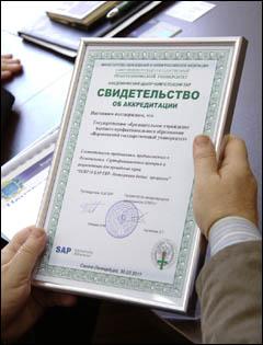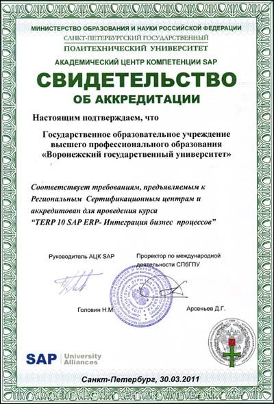 Со своей стороны, директор программ партнерства с высшими учебными заведениями и научно-исследовательскими организациями фирмы SAP Виктор Таратухин поблагодарил ректора ВГУ и вручил ему сертификат, подтверждающий, что ВГУ соответствует требованиям, предъявляемым к Региональным Сертификационным центрам SAP: «Хочу подтвердить, что Воронежский государственный университет прошёл полную процедуру аккредитации сертификационного центра, и теперь на базе ВГУ можно читать сертификационный курс SAP».
