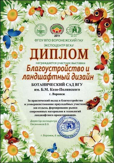 Ботанический сад ВГУ им. проф. Б.М. Козо-Полянского награжден дипломом за практический вклад в благоустройство и усовершенствование приусадебных участков, зон отдыха, формирование рынка современных материалов и технологий ландшафтного проектирования универсальной выставки-ярмарки «Благоустройство и ландшафтный дизайн – 2011».