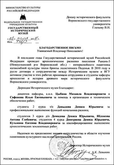 Первое письмо от директора Государственного Исторического музея Алексея Левыкина адресовано Владимиру Глазьеву, декану исторического факультета ВГУ. Руководство Исторического музея благодарит доцентов кафедры археологии и истории древнего мира Михаила Цыбина, Илью Сафонова, а также студентов Дениса Давыдова, Дениса Демидова, Антона Яблокова, Дениса Дмитриева, Евгения Кузьмина за профессиональную организацию и квалифицированное выполнение археологических раскопок поселения Рыкань–3 (Новоусманский район Воронежской области).