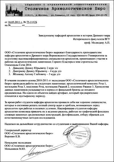 Второе письмо от ООО «Столичное археологическое бюро», адресованное Александру Медведеву, заведующему кафедрой археологии и истории древнего мира, содержит слова благодарности преподавателям кафедры за подготовку высококвалифицированных специалистов-археологов (Дениса Давыдова, Антона Яблокова, Дениса Дмитриева), принимавших участие в работах на археологических памятниках горного кластера в зоне строительства Олимпиады 2014 года в Сочи. «За время работы студенты … проявили себя как хорошие специалисты, которые способны решать полный спектр задач и проблем, возникающих перед археологом при работах в полевых условиях».