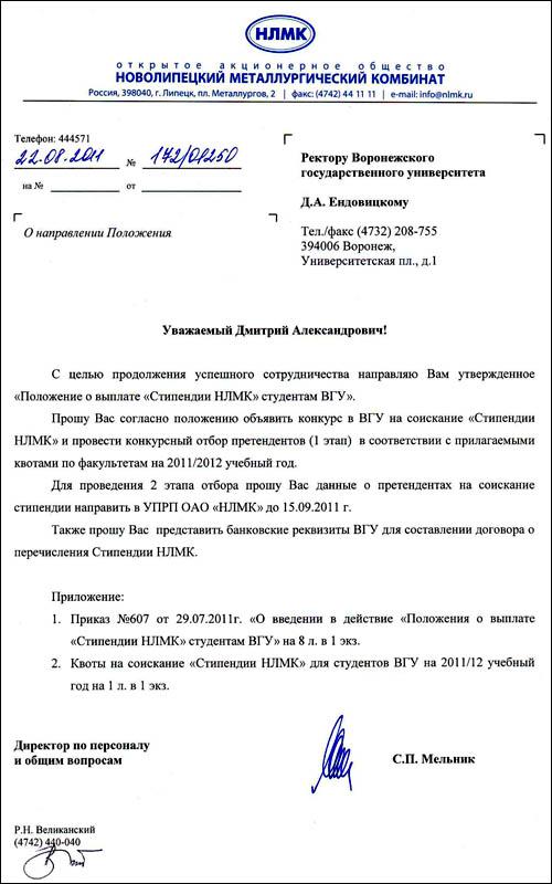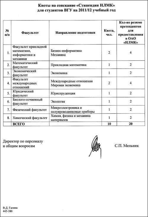 В рамках реализации Соглашения о стратегическом партнерстве в образовательной, научно-исследовательской и консалтинговой деятельности между ВГУ и ОАО «НЛМК» и с целью продолжения успешного сотрудничества руководство одной из крупнейших металлургических компаний в мире приняло решение о выплате «Стипендий НЛМК» наиболее талантливым студентам университета, успешно прошедшим конкурсный отбор.