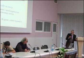 На заседании с докладами выступили академик РАН В.Л. Макаров (Москва, ЦЭМИ РАН) – «Перед какой развилкой останавливается Россия», академик РАН В.М. Полтерович (Москва, ЦЭМИ РАН) – «Формирование массовой ипотеки в России: подготовка краснодарского эксперимента», член-корр. РАН Г.Б. Клейнер (Москва, ЦЭМИ РАН) – «Системная экономика: синопсис».