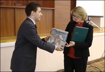 Экспертная группа, а также администрация нашего вуза в лице проректора по учебной работе профессора Елены Ищенко обменялись благодарностями за успешное проведение конкурсного отбора. Представители Фонда вручили нашему университету диплом участника и альбом живописи Александра Дейнеки, изданный в рамках одного из проектов фонда.