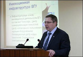 На Учёном совете центральное место занял вопрос «О реализации задачи развития инновационной направленности научных подразделений ВГУ», с обстоятельным докладом по которому выступил проректор по научной работе, инновациям и информатизации, профессор Василий Попов.