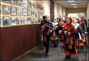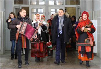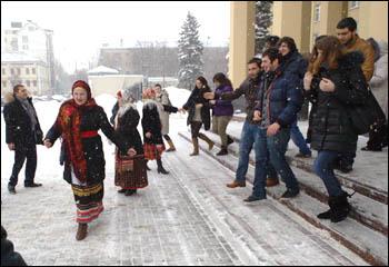 Праздничное шествие с разудалыми частушками и народными песнями, каждый год проходящее в стенах вуза, началось на втором этаже главного учебного корпуса, и продолжилось на улице огромным хороводом.