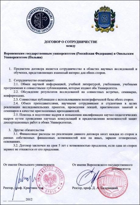 Воронежский государственный университет заключил договор о сотрудничестве с Опольским университетом (г. Ополе, Польша).