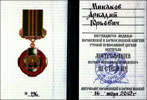 Директор зональной научной библиотеки ВГУ, доктор исторических наук Аркадий Минаков был награждён медалью святителя Митрофания Воронежской и Борисоглебской епархии III степени.
