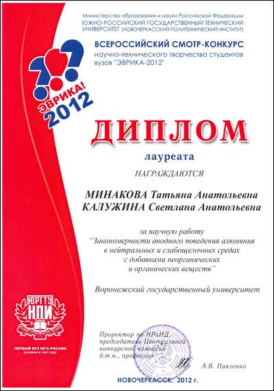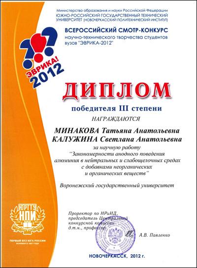 В мае-июне на базе Южно-Российского государственного технического университета Министерство образования и науки РФ проводило Всероссийский смотр-конкурс научно-технического творчества студентов вузов «ЭВРИКА-2012», в котором приняли участие и студенты ВГУ.