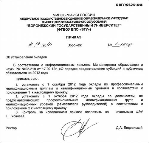 В соответствии с информационным письмом Министерства образования и науки РФ № 02-219 от 17.02.2012 года «О порядке предоставления субсидий и публичных обязательств на 2012 год», ректор ВГУ, профессор Дмитрий Ендовицкий подписал приказ № 1-1549 от 21.09.2012 «Об установлении окладов», согласно которому, оклады сотрудников нашего университета с 1 октября 2012 года повышаются на 6%.