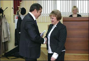 Ректор ВГУ, профессор Д.А. Ендовицкий вручил удостоверение и знак «Почетного работника высшего профессионального образования РФ» заведующей кафедрой социологии и политологии, профессору А.В. Глуховой.