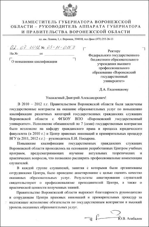Юрий Агибалов благодарит Воронежский государственный университет и Центр правовых инноваций и примирительных процедур ВГУ за оказание образовательных услуг по повышению квалификации различных категорий государственных гражданских служащих Воронежской области.