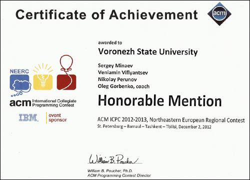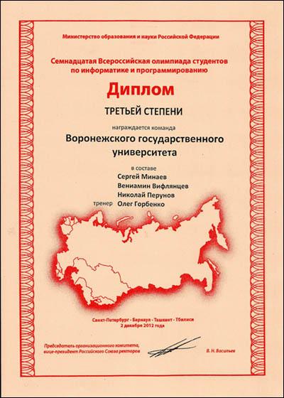 По итогам полуфинальных соревнований команда студентов ВГУ в составе Сергея Минаева (капитан команды, 2 курс, ПММ), Вениамина Вифлянцева (4 курс, ПММ) и Николая Перунова (2 курс, ПММ) заняла третье место.