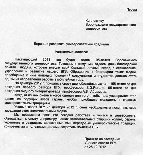Участники заседания единодушно приняли Обращение к коллективу ВГУ «Беречь и развивать университетские традиции», направленное на достойную встречу предстоящего 95-летия ВГУ.