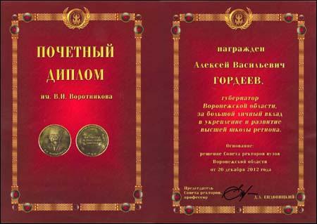 С инициативой о награждении Почетным дипломом имени В.И. Воротникова губернатора Воронежской области Алексея Васильевича Гордеева выступил председатель Совета ректоров вузов, ректор ВГУ, профессор Дмитрий Александрович Ендовицкий. Его предложение получило единогласную поддержку Совета ректоров. Алексей Васильевич стал первым, кто награжден дипломом.
