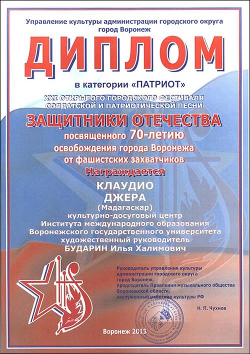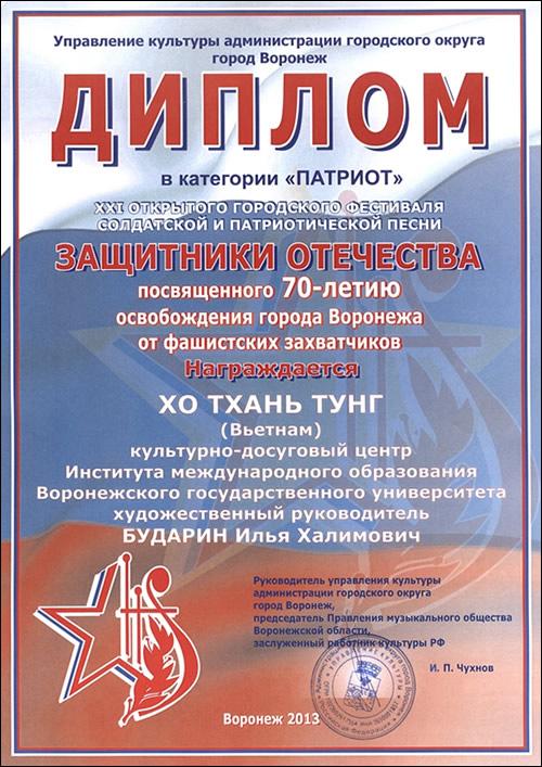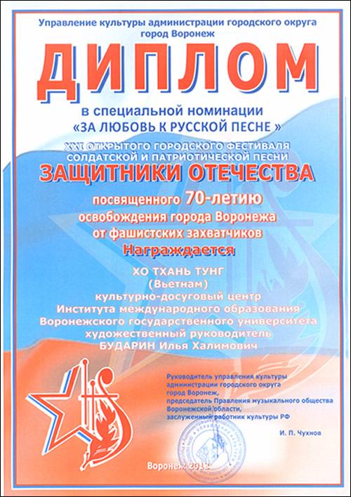 23 февраля студенты Института международного образования ВГУ Хо Тхань Тунг (СРВ) и Клаудио Джерра (Мадагаскар), победившие в районном туре XXI открытого городского фестиваля солдатской и патриотической песни «Защитники Отечества», приняли участие в гала-концерте фестиваля. Хо Тхань Тунг также был награжден дипломом в специальной номинации «За любовь к русской песне».