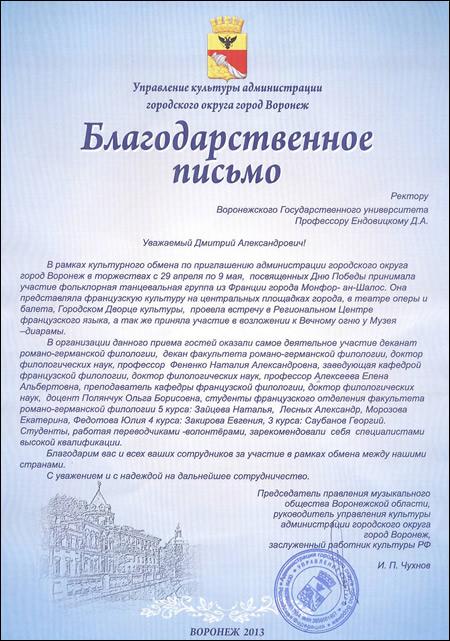По итогам визита на имя ректора ВГУ, профессора Дмитрия Ендовицкого было получено благодарственное письмо от руководителя управления культуры городского округа город Воронеж Ивана Чухнова, в котором он благодарит ректора и сотрудников ВГУ «за участие в рамках обмена между нашими странами» и выражает надежду на дальнейшее сотрудничество.