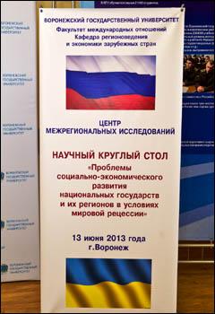 13 июня в Воронежском государственном университете состоялась работа международного научного круглого стола «Проблемы социально-экономического развития национальных государств и их регионов в условиях мировой рецессии», организаторами которого выступили кафедра регионоведения и экономики зарубежных стран – Центр межрегиональных исследований факультета международных отношений ВГУ.