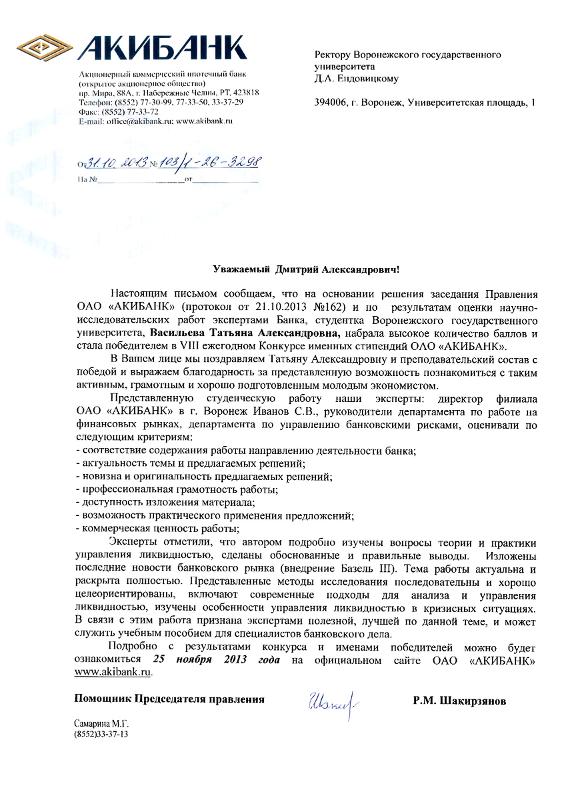 В своём письме на имя ректора ВГУ, профессора Дмитрия Ендовицкого помощник председателя правления АКИБАНКа Р.М. Шакирзянов поздравил Татьяну Александровну и преподавательский состав с победой и выражаем благодарность за предоставленную возможность познакомиться с таким активным, грамотным и хорошо подготовленном молодым экономистом.