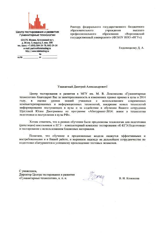 В своём письме на имя ректора ВГУ, профессора Дмитрия Ендовицкого директор центра тестирования и развития «Гуманитарные технологии» В.Н. Кононова поблагодарила наш вуз за «заинтересованность в изменениях правил приёма в вузы в 2014 году, в оценке уровня знаний учащихся с использованием современных компьютеризированных и информационных технологий, внедрение новых технологий информирования поступающих в вузы» и выразила надежду на продолжение сотрудничества.