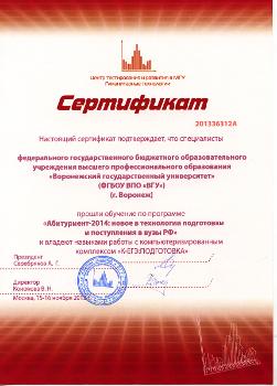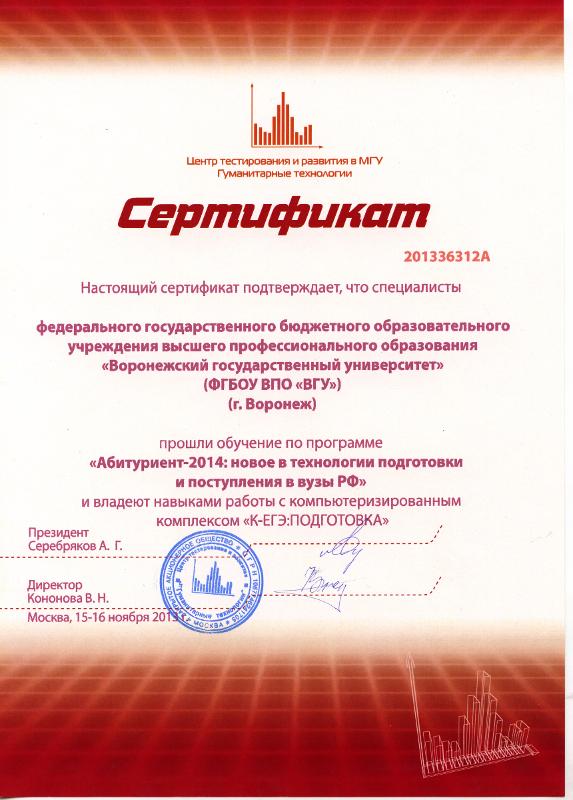 Заведующая подготовительными курсами ВГУ Юлия Щеглова прошла обучение в центре тестирования и развития в МГУ «Гуманитарные технологии» по программе «Абитуриент–2014: новое в технологии подготовки и поступления в вузы РФ» и получила от организаторов соответствующий сертификат.