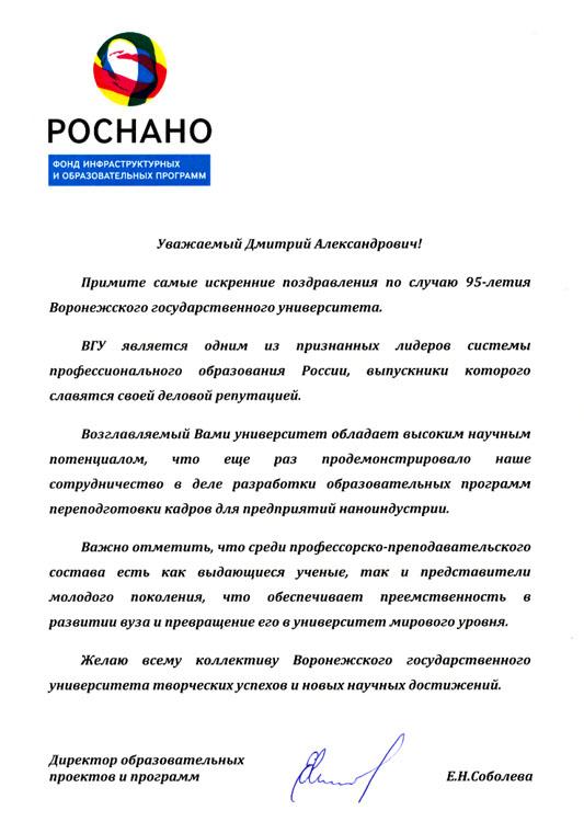 На имя ректора ВГУ, профессора Дмитрия Ендовицкого получен поздравительный адрес по случаю 95-летия университета от директора образовательных проектов и программ Фонда инфраструктурных и образовательных программ РОСНАНО Е.Н. Соболевой.