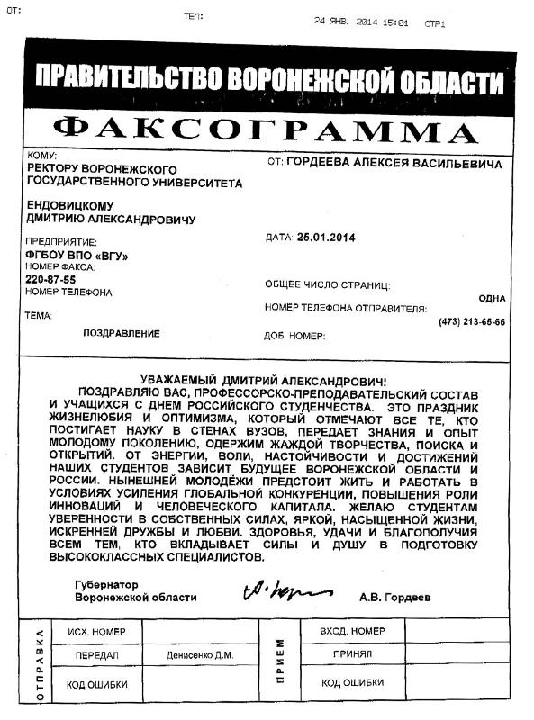 Губернатор Воронежской области Алексей Гордеев поздравил ректора ВГУ, профессора Дмитрия Ендовицкого, профессорско-преподавательский состав и учащихся с Днём российского студенчества.