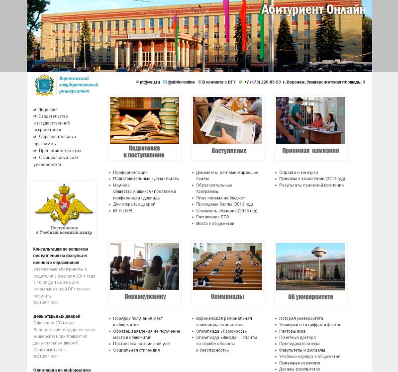 В рамках подготовки к этому знаменательному событию осуществлено обновление и редизайн портала ВГУ для абитуриентов «Абитуриент-онлайн». Традиционно, каждый посетитель портала может получить наиболее полную и достоверную информацию о поступлении в ВГУ, подготовительных курсах, олимпиадах и различных мероприятиях для школьников, проводимых нашим университетом.