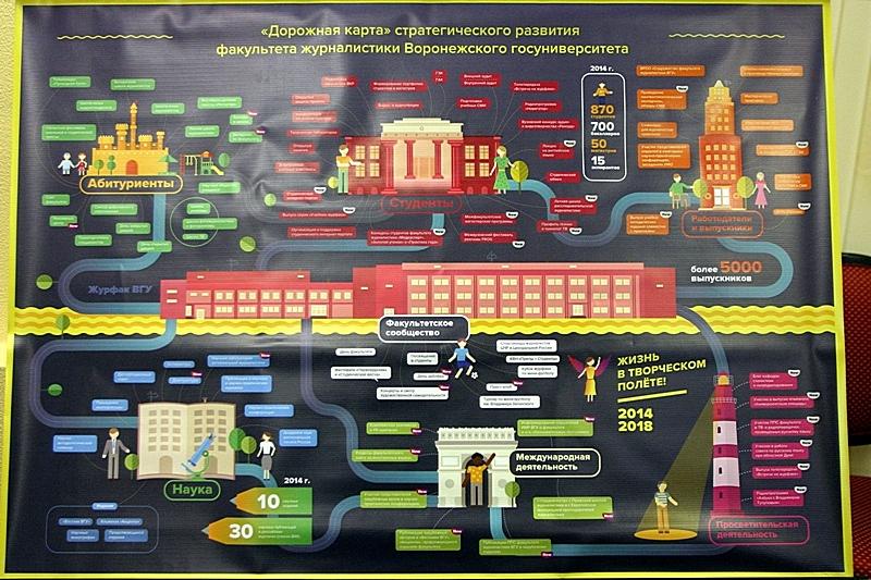 Следующим выступил декан факультета журналистики, профессор Владимир Тулупов. Он рассказал о развитии факультета, профилях, кафедрах, новых направлениях, представил собравшимся «дорожную карту» стратегического развития факультета на период с 2014 по 2018 год. Карта была составлена на основе SWOT-анализа, и представляет собой описание сильных и слабых сторон журфака, возможностей и угроз, а также новых запланированных мероприятий по работе с абитуриентами, студентами, выпускниками: